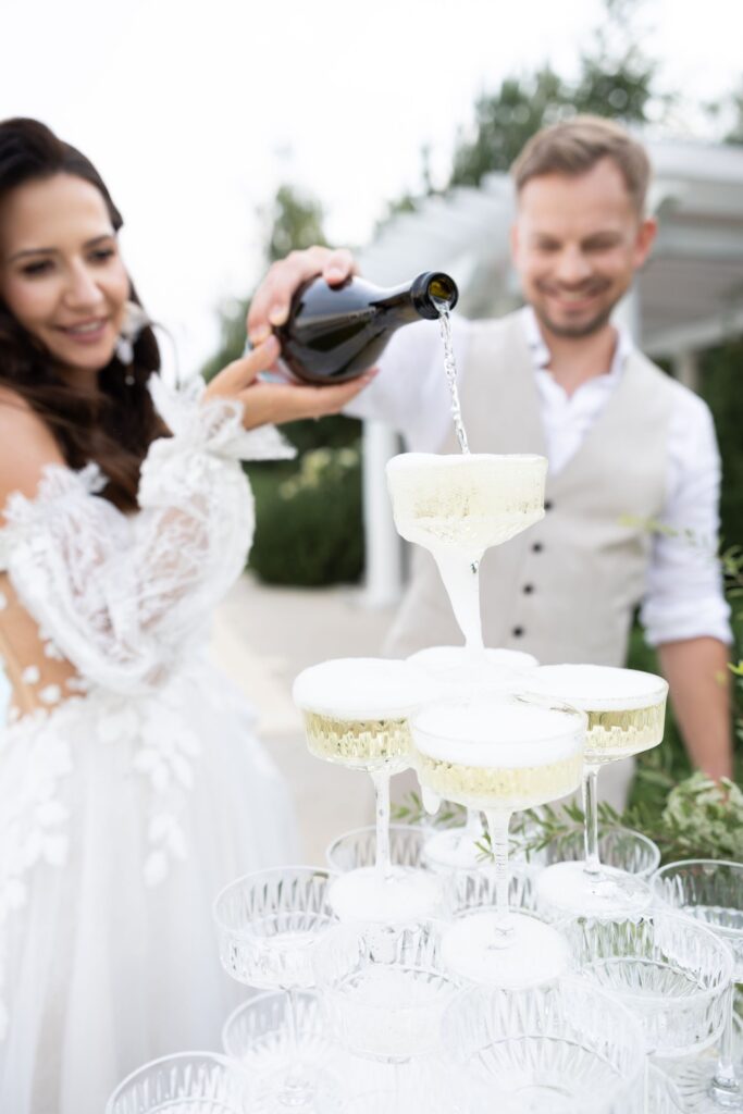 Champagne Tower cieszy się coraz większą popularnością w naszej ofercie. To wieża z kieliszków, którą budujemy na miejscu – od małych konstrukcji, po spektakularne, wielopoziomowe wieże. Prosecco jest wlewane, tworząc widowiskowy, kaskadujący strumień.